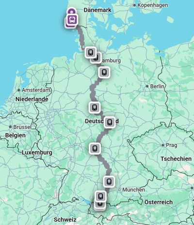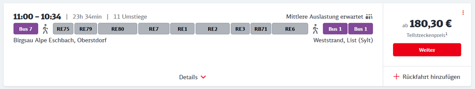 Wenn ich mir dazu eine konkrete Fahrplanauskunft anschaue, wird das Ganze plötzlich greifbar. Die Strecke könnte zum Beispiel so aussehen: Start in Oberstdorf, von dort nach Ulm. Weiter geht es nach Augsburg, anschließend nach Würzburg. Von dort fahre ich weiter nach Göttingen und schließlich nach Hamburg. Und ganz zum Schluss geht es mit dem Regionalzug über den Hindenburgdamm nach Westerland auf Sylt.